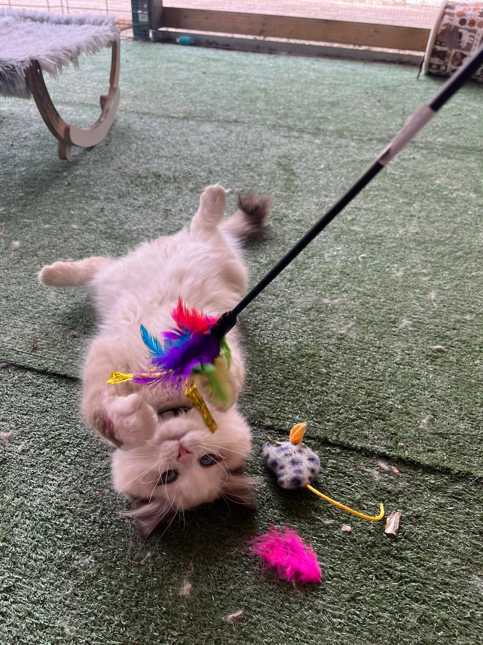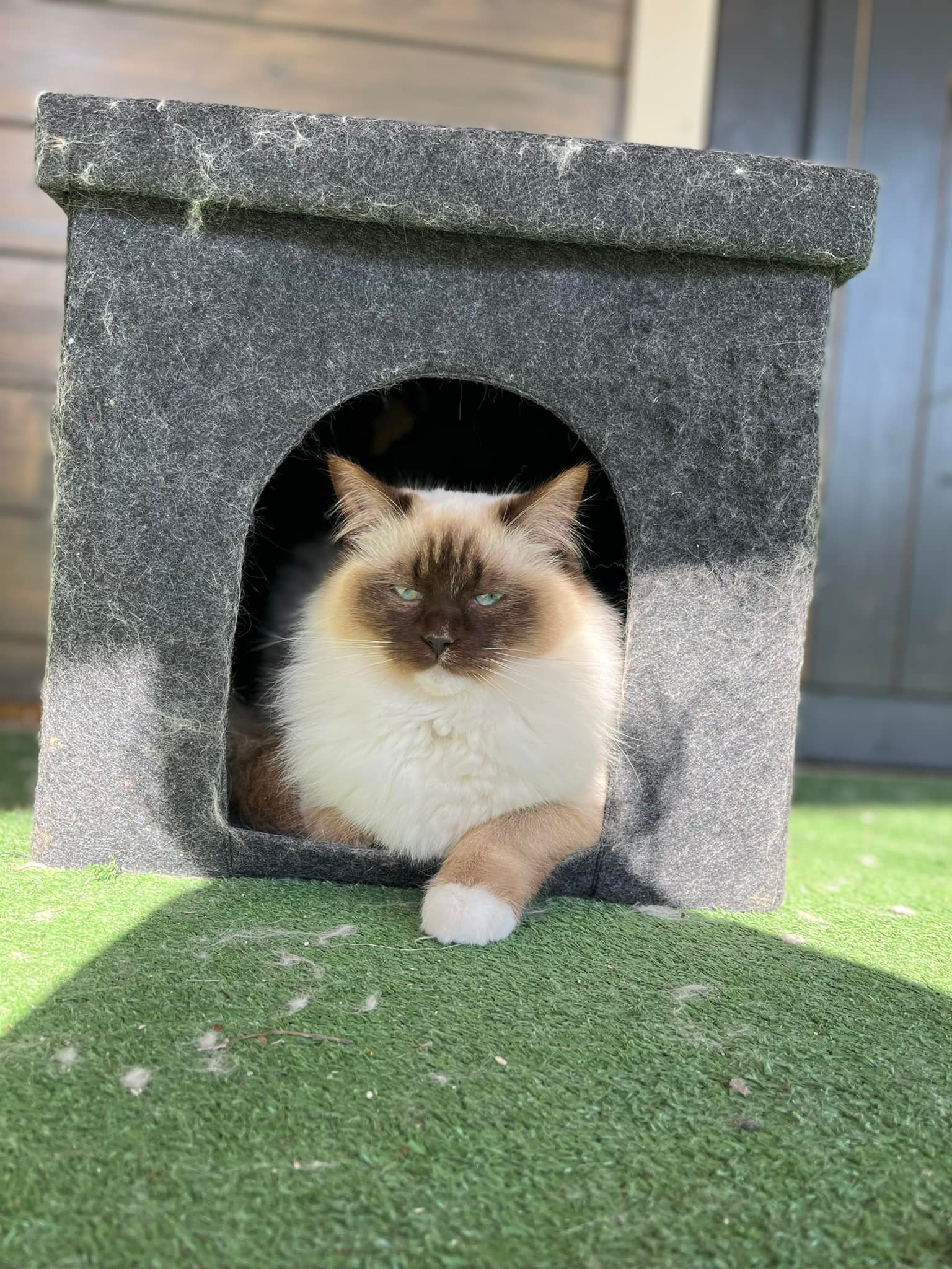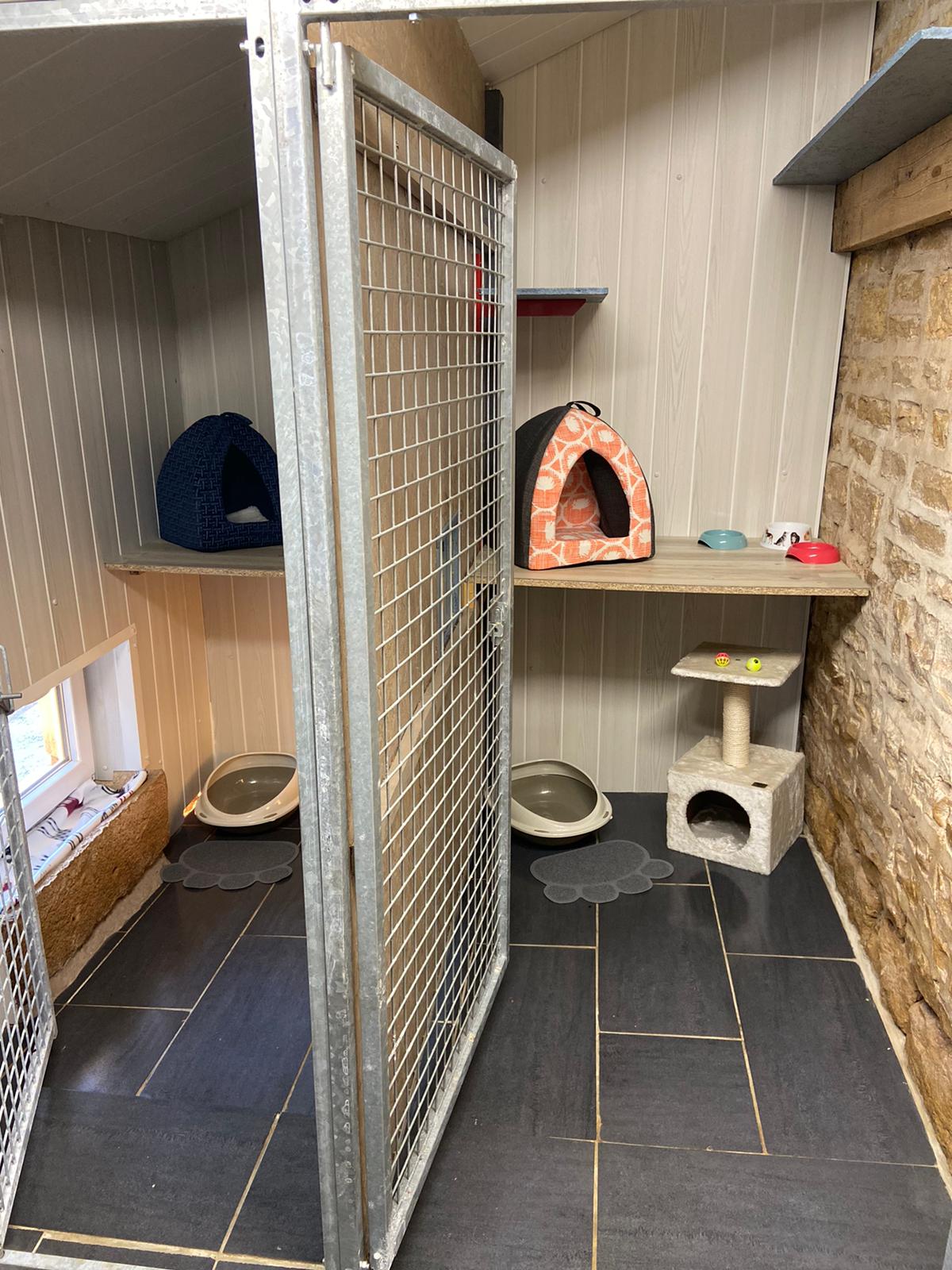 Box individuel avec mezzanine où les pensionnaires auront une vue sur l’extérieur. Equipé d’arbre à chat, de jouets, d’une litière et de gamelles.